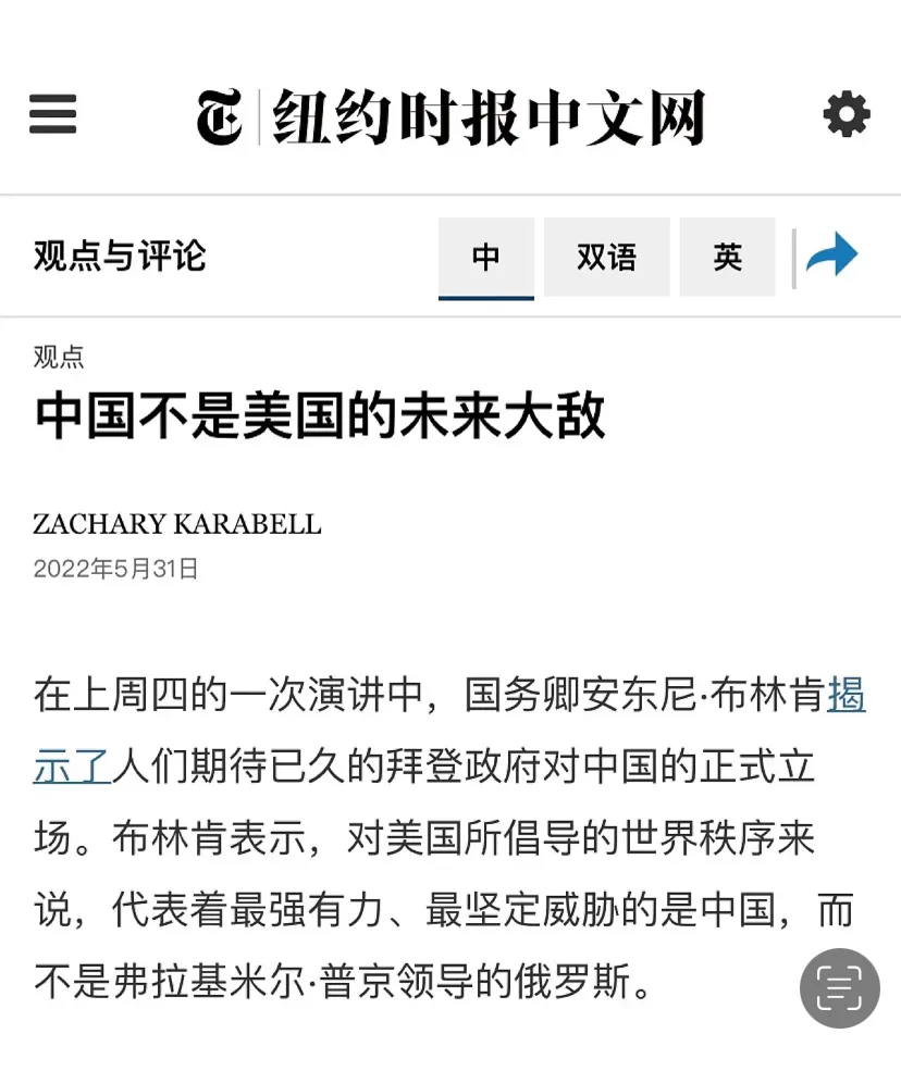 纽约时报今天发表评论说:“中国不是美国的未来大敌:国务卿布林肯上周四公布了拜登政府对