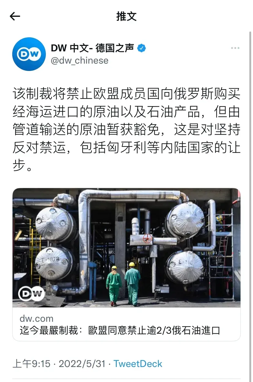 欧盟同意禁止三分之二的俄罗斯石油进口,但只针对海运石油,管道石油暂不禁止,这是欧盟对