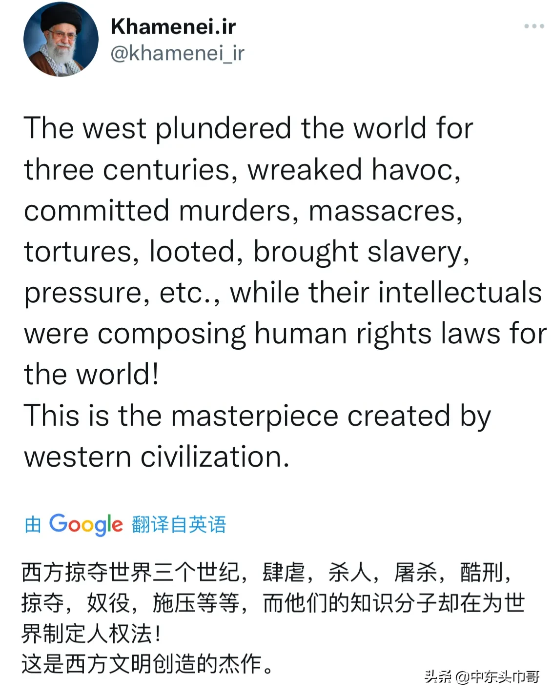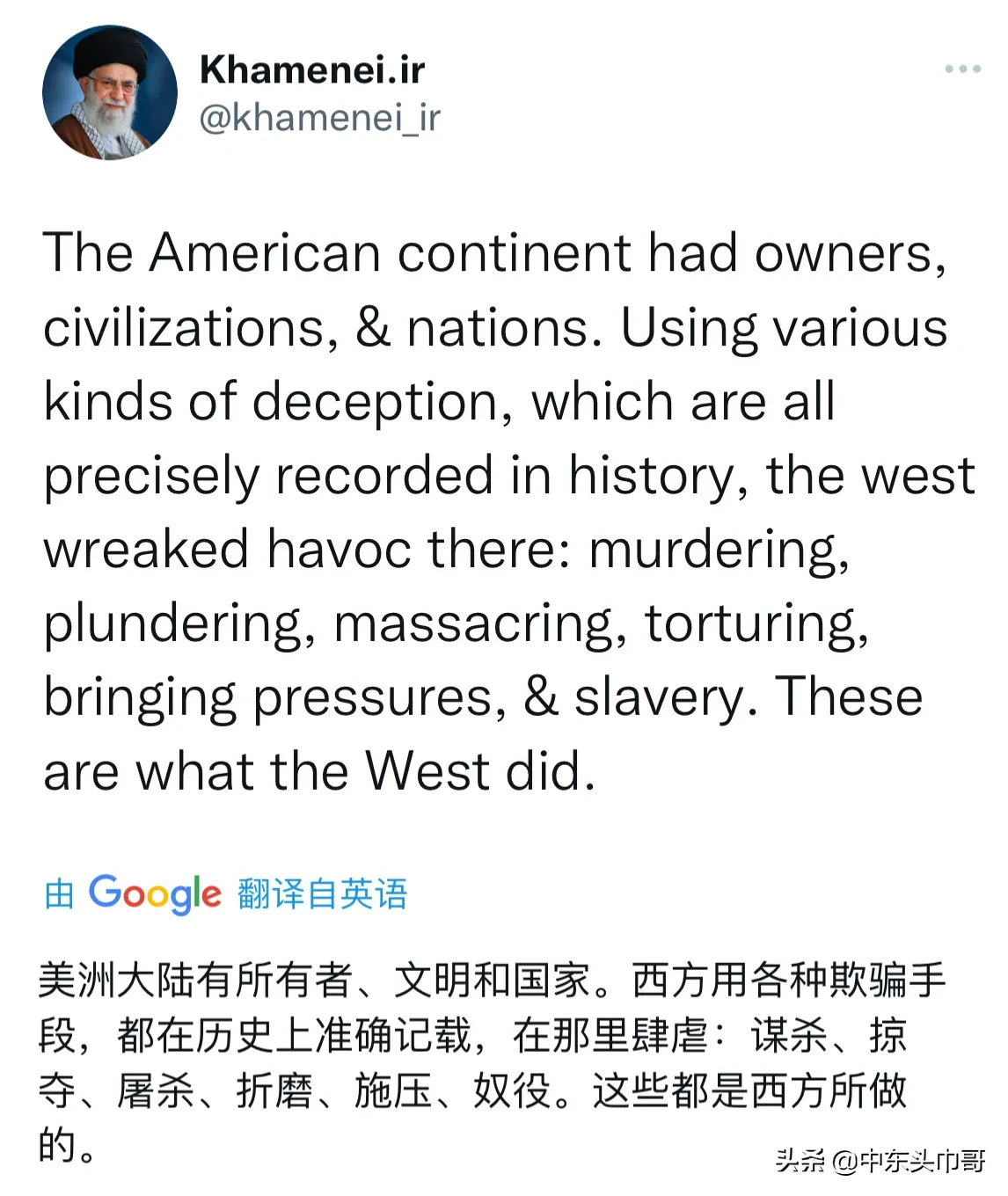 不愧是反美旗手!伊朗最高领袖哈梅内伊最新批评西方的言论,“西方掠夺世界三个世纪,肆虐,杀人,屠杀,酷刑,掠夺,奴役,施压等等,而他们的知识分子却在为世界制定人权法!这是西方文明创造的杰作。美洲大陆本来有所有者、文明和国家。西方用各种欺骗手段,都在历史上准确记载,在那里肆虐:谋杀、掠夺、屠杀、折磨、施压、奴役。这些都是西方所做的。”