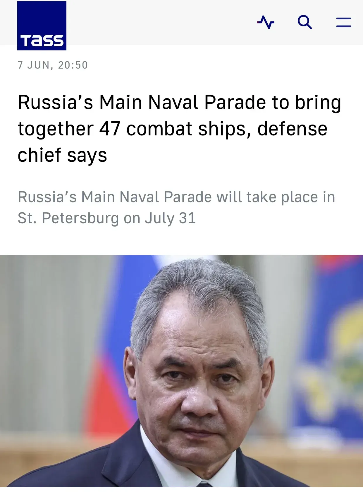 莫斯科阅兵还不到一个月,俄罗斯又宣布圣彼得堡海军大阅兵,莫斯科阅兵是在5月9日举行的,目的在于纪念反法西斯卫国战争胜利77周年,当时,俄罗斯展示了俄罗斯核武器,如今,俄罗斯国防部部长绍伊古6月7日宣布圣彼得堡海军大阅兵。圣彼得堡海军大阅兵将在7月31日举行,届时,海军方队由47艘战舰,还有炮舰和潜舰等200多艘不同级别的船舰组成。圣皮得堡仅仅是海军大阅兵的主场,俄罗斯所有的海军基地都将举行阅兵,为了向全球展示俄罗斯海军实力,俄罗斯还将开通现场直播。