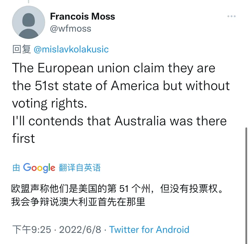 欧洲议会克罗地亚籍议员米斯拉夫·克拉库西奇6月8日说道:“今天的欧盟外交、国防和安全政策可以用一句话来描述。欧盟成为美国的第 51 个联邦州,但没有投票权。”[机智]评几句:有网友说,澳大利亚才是第51个。还有网友说:“英国首先出现在那里。所有其他的走狗都在后面排队。”其实,这个就不用争了,澳大利亚、英国、日本排名不分先后。