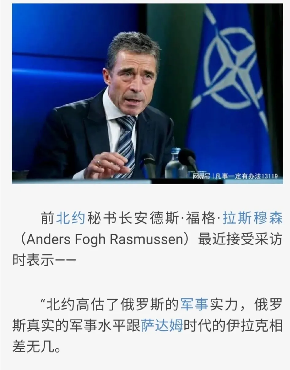 就是要搞垮俄罗斯!!前北约秘书长说了,俄罗斯实力也就是萨达姆时期的伊拉克,军事实力被