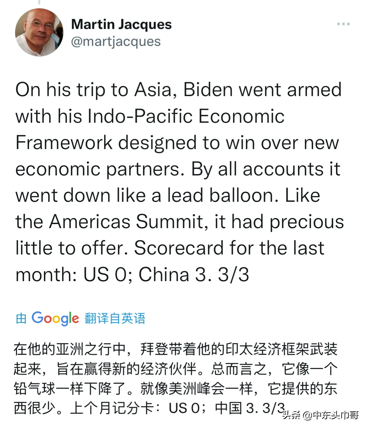 英国学者马丁雅克说,三个事件告诉我们,美国遏制中国的努力是白日做梦。最新的是美国赞助的美洲峰会的崩溃。这个峰会可能失败,墨西哥和其他国家已经退出。相比之下,中国在美国的后院拉丁美洲大举进军。一些太平洋岛国希望与中国建立更密切的关系,中国已与所罗门群岛达成协议。长期以来,美国一直认为太平洋和拉丁美洲一样是其势力范围,它现在处于落后地位。谁能预料到这一点?在他的亚洲之行中,拜登带着他的印太经济框架武装起来,旨在赢得新的经济伙伴。总而言之,它像一个铅气球一样下降了。就像美洲峰会一样,它提供的东西很少。上个月记分卡:美国 0;中国 3。