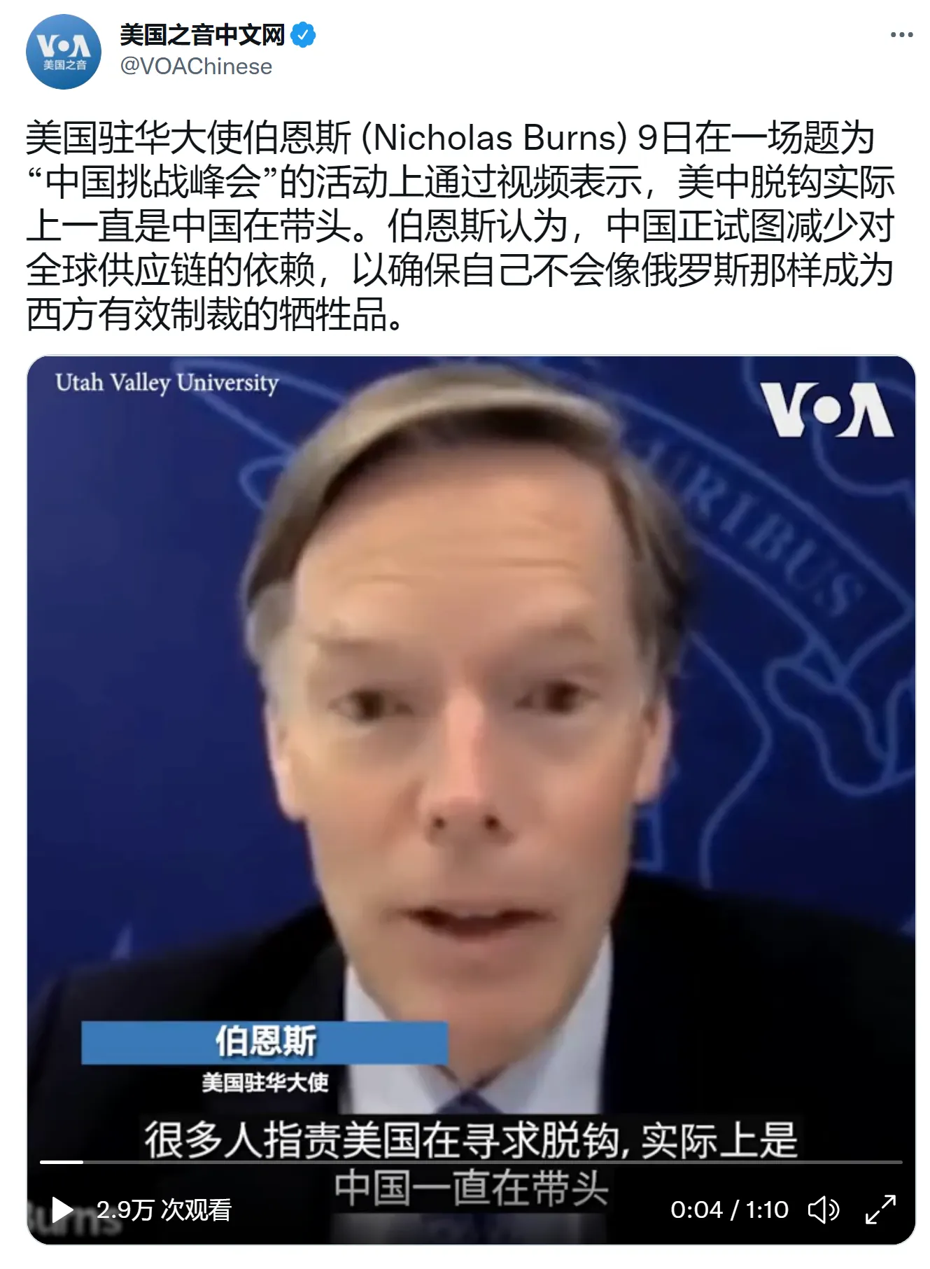 美国之音今天发文说:“美国驻华大使伯恩斯 6月9日在一场题为‘中国挑战峰会’的活动上通