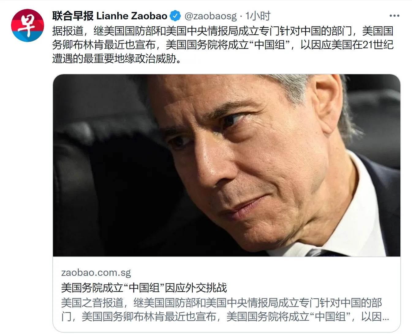 联合早报今天(6月10日)发文说:“继美国国防部和美国中央情报局成立专门针对中国的部门,美国国务卿布林肯最近也宣布,美国国务院将成立‘中国组’,以因应美国在21世纪遭遇的最重要地缘政治威胁。”据报道,美国国务院计划增设的“中国组”预计60人编制,专注于追踪中国官员的行跡,以及追踪中方在全球主要国家的布局动态。中国致力于和平崛起,中国的崛起也是世界的机遇,但美国为了维护霸权,把中国崛起视为地缘政治威胁,这就是“没有敌人也要制造一个敌人”,使得中美关系陷入很大的困境。