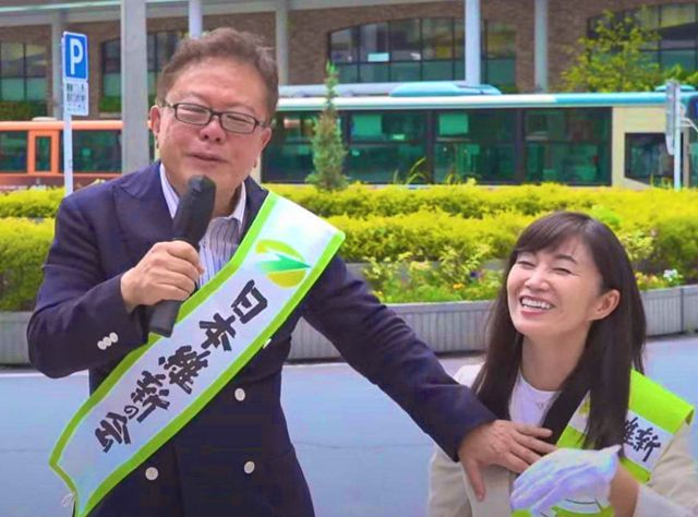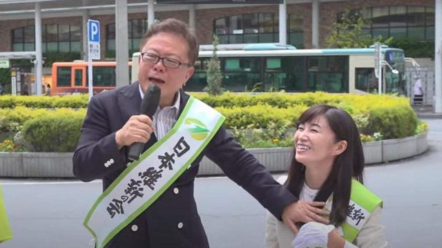 日本前东京都知事一边演说,一边乱摸女候选人的胸部的画面曝光