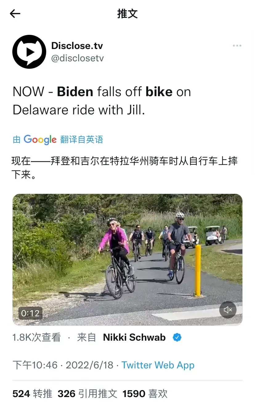 据美国“揭露”视频网站消息:拜登昨天在特拉华州骑自行车准备停车时摔倒,摔倒时状态不好