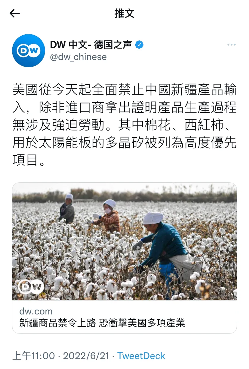 德国之声今天报道:“美国从今天起全面禁止中国新疆产品输入,除非进口商拿出证明产品生产
