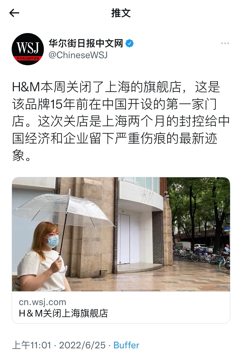 华尔街日报今天(6月25日)报道:“H&M本周关闭了上海的旗舰店,这是该品牌15年前在中国开设的第一家门店。这次关店是上海两个月的封控给中国经济和企业留下严重伤痕的最新迹象。”[机智]评几句:这又是一个“杀人犯因为逃跑时偷了一辆自行车而被判死刑”的话术表演。H&M关闭上海旗舰店跟上海抗击疫情没有任何关系,与H&M抵制新疆棉才是直接相关。谁抵制新疆棉和其他产品,谁就必须放弃中国市场。所有参与抵制所谓新疆棉的美西方企业都应该关门。这是中国市场的选择,也是中国人民的选择。