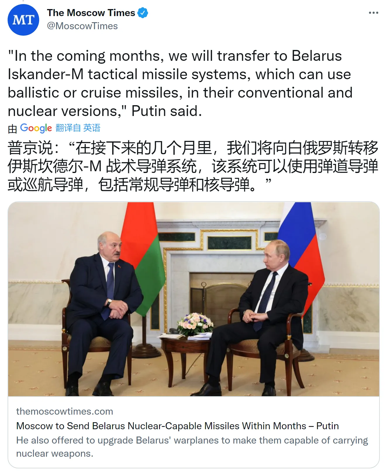莫斯科时报今天(6月26日)发文说:俄罗斯总统弗拉基米尔·普京在接见白俄罗斯领导人亚历山大·卢卡申科时表示,俄罗斯将在未来几个月内向白俄罗斯运送能够携带核弹头的导弹。普京说:“在接下来的几个月里,我们将向白俄罗斯转移伊斯坎德尔-M 战术导弹系统,该系统可以使用弹道导弹或巡航导弹,包括常规导弹和核导弹。”卢卡申科告诉普京,他对邻国立陶宛和波兰的“侵略性”、“对抗性”和“排斥性”政策表示担忧。在谈及美国及北约飞机在白罗斯边境附近进行携带核弹头的训练飞行时,他也要求普京帮忙做出对等举措。普京承诺,将确保白俄罗斯和其他集体安全条约组织成员国的安全。