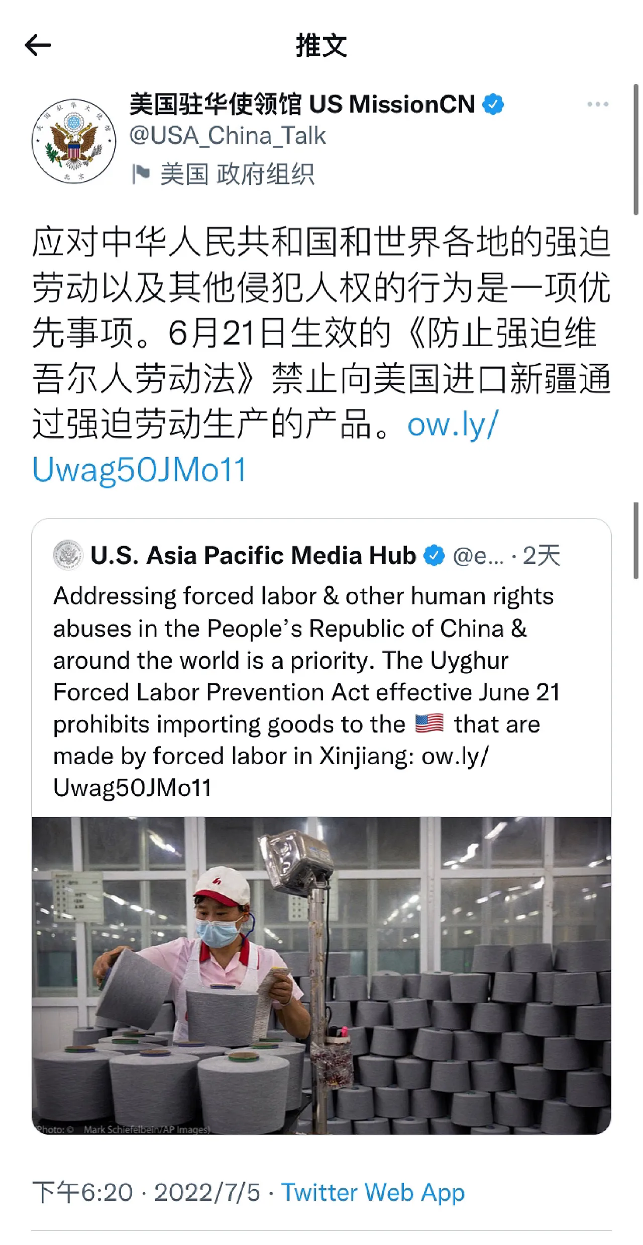 美国驻华使领馆今天(7月5日)抹黑污蔑道:“应对中华人民共和国和世界各地的强迫劳动以及其他侵犯人权的行为是一项优先事项。6月21日生效的《防止强迫维吾尔人劳动法》禁止向美国进口新疆通过强迫劳动生产的产品。”[机智]评两句:谎言说千万次,依旧还是谎言,但是小心撒谎遭报应。美国也真的是精神分裂,一边和中国视频通话谈经济,一边捏造谎言制裁中国新疆。美国怎么想的?