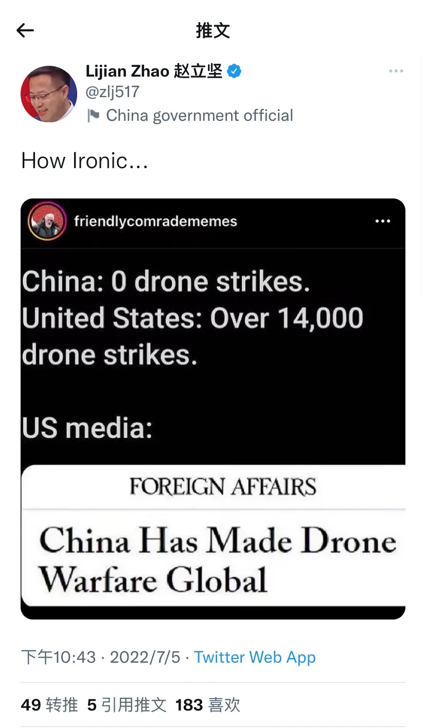 “多么讽刺.....”,我国外交部发言人赵立坚在社交网络上发了一张图,配了这样一句话。图片中指出,中国实施的无人机攻击次数为0,美国实施的无人机攻击已经超过1400次,但尽管如此,美媒《外交事务》仍宣称“中国将无人机战争推向全球”。对于睁眼说瞎话这一点,美国最为擅长,明明自己是世界和平的破坏者,却总在捏造借口给其他国家乱泼脏水;明明自家人权一团糟,却总是在国际上扮演“人权教师爷”,对别国随意说教。但正所谓纸包不住火,不管他们制造多少假消息,堵住多少人的嘴,都改变不了美国是霸权主义国家,是世界动乱制造者的事实。这两年已经有越来越多的国家开始看清美国的真面目,美国引以为傲的霸权和世界影响力正遭到冲击和动摇,未来的国际社会不再会是他们的“一言堂”。头条热榜