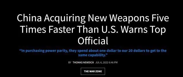 美国《动力》网站战区频道7月6日发文称,中国获得新武器的速度是美国的5到6倍,军费购买力
