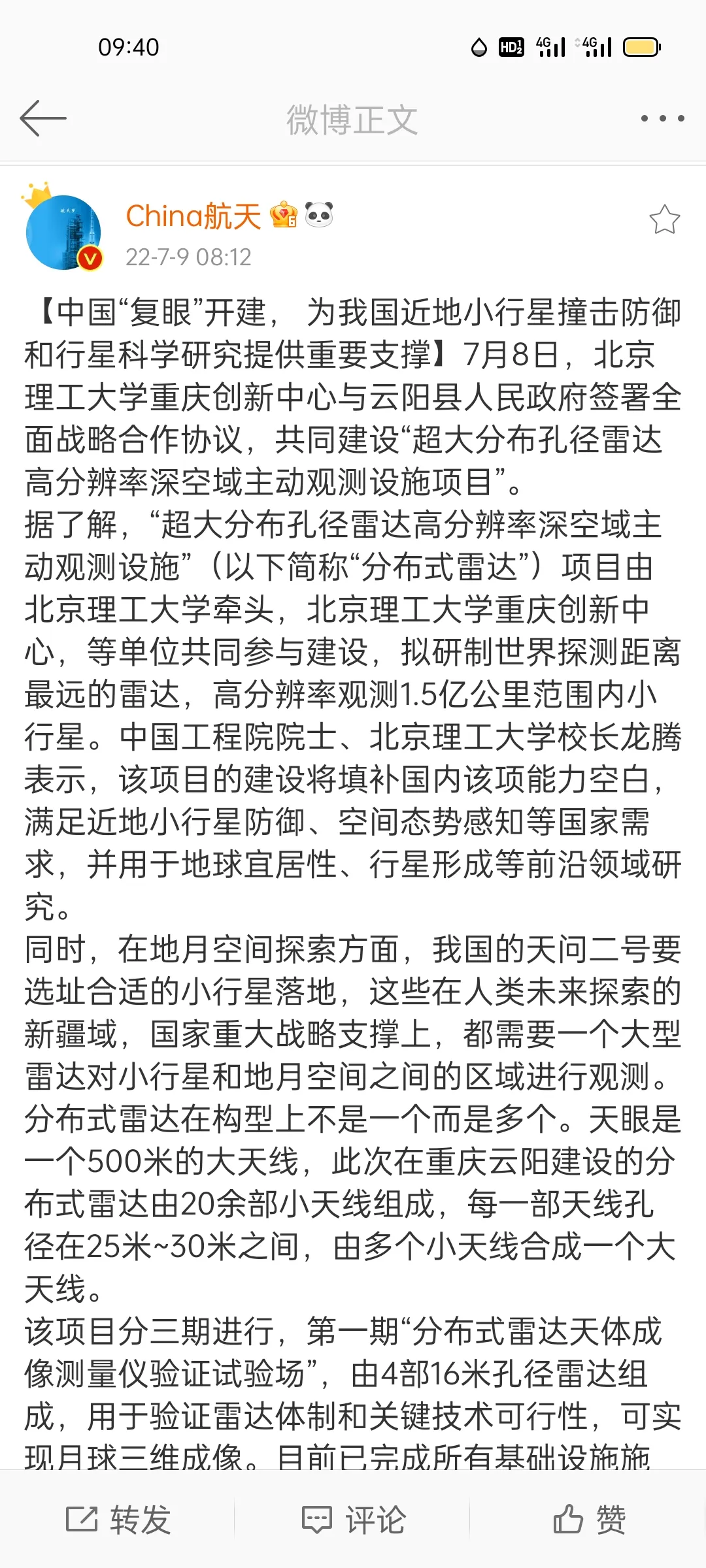 中国“复眼”:“超大分布孔径雷达高分辨率深空域主动观测设施项目”开建。 我不太懂,这个和天眼比较起来,算不算重复建设啊? 不算,天眼是被动接收信号,这个是主动发出信号…… 按我的理解,天眼是监测各类波、射线、辐射信号的,这个是监测小行星实物的。 简而言之,近地小行星防御、空间态势感知。近地小行星是“大菜”。对于空中洲际导弹飞行侦测是小菜一碟。