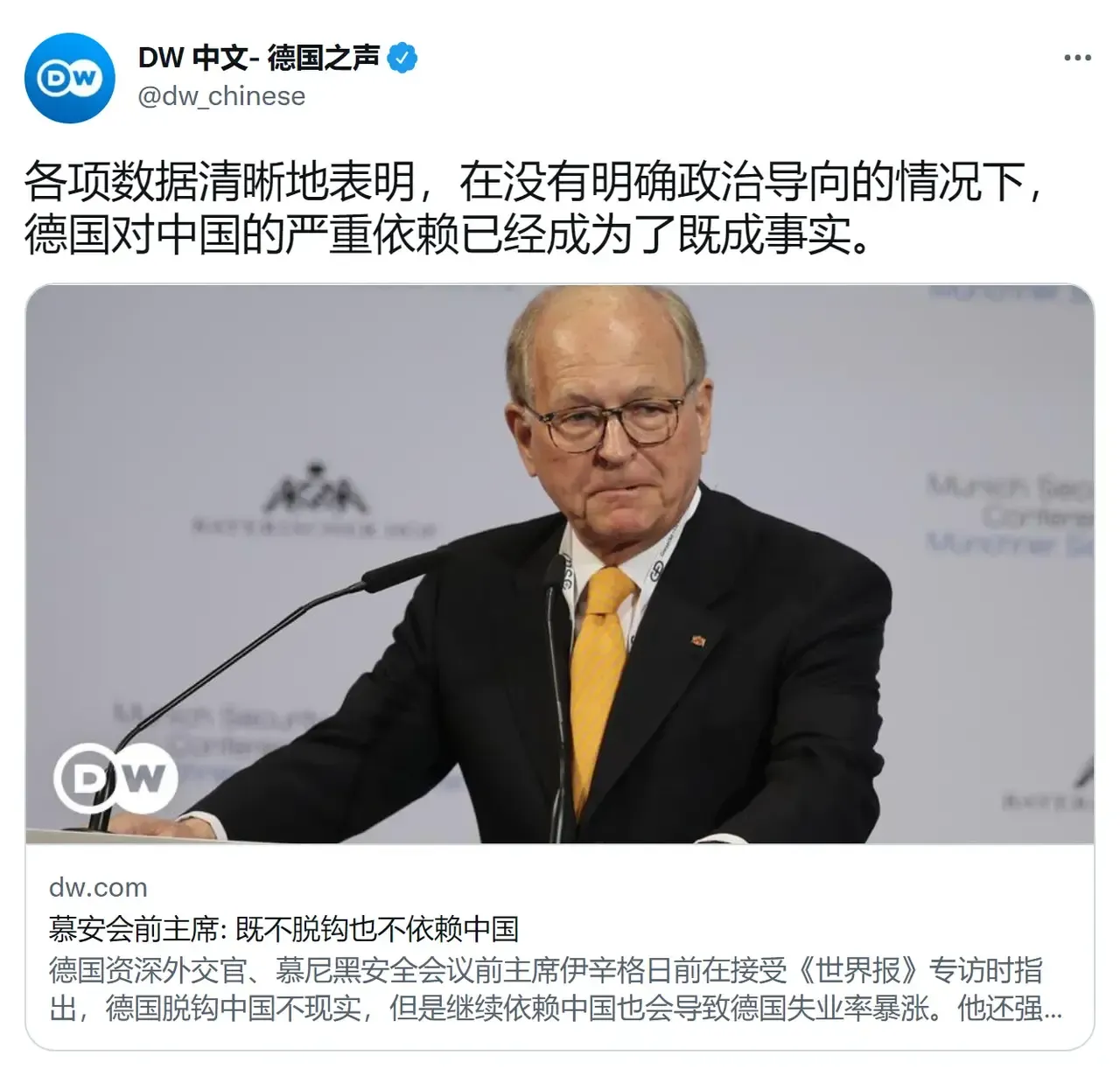 德国对中国的严重依赖已经成为了既成事实,德国之声转述了德国资深人士伊辛格的这一观点,此人当了14年的慕尼黑安全会议主席,见证对中德关系的发展,对中德关系理解比较深刻,他说20年前德国主张积极将汽车销售中国,20年后,大众40%的销售额都来自于中国,德国依赖中国已不可逆转。伊辛格同时还认为,不能把中国和俄罗斯等同,强硬推动中德脱钩只会助推德国高通胀,伤害德国经济的发展,而且,谁愿意放弃中国巨大市场孕育的商机呢?伊辛格也承认,德国依赖中国也存在风险,需要审视中德贸易和投资的战略选择,必要时改变这种依赖程度,比如大众40%销售额在中国,也由此造成德国的高失业率。
