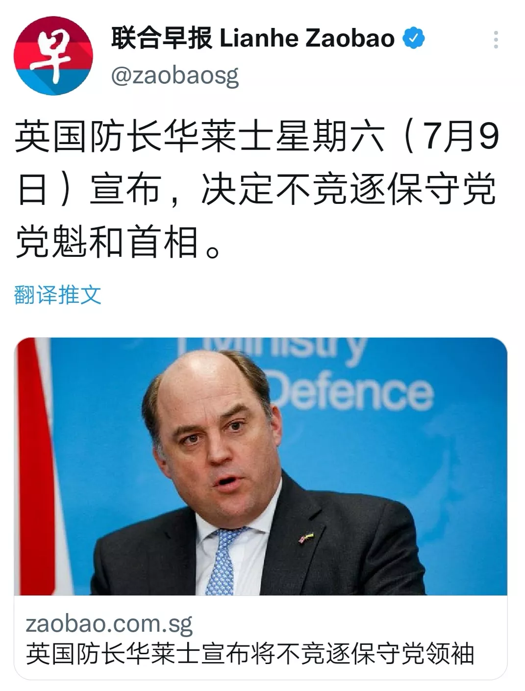 特拉斯机会来了,国防大臣华莱士宣布不参加竞选