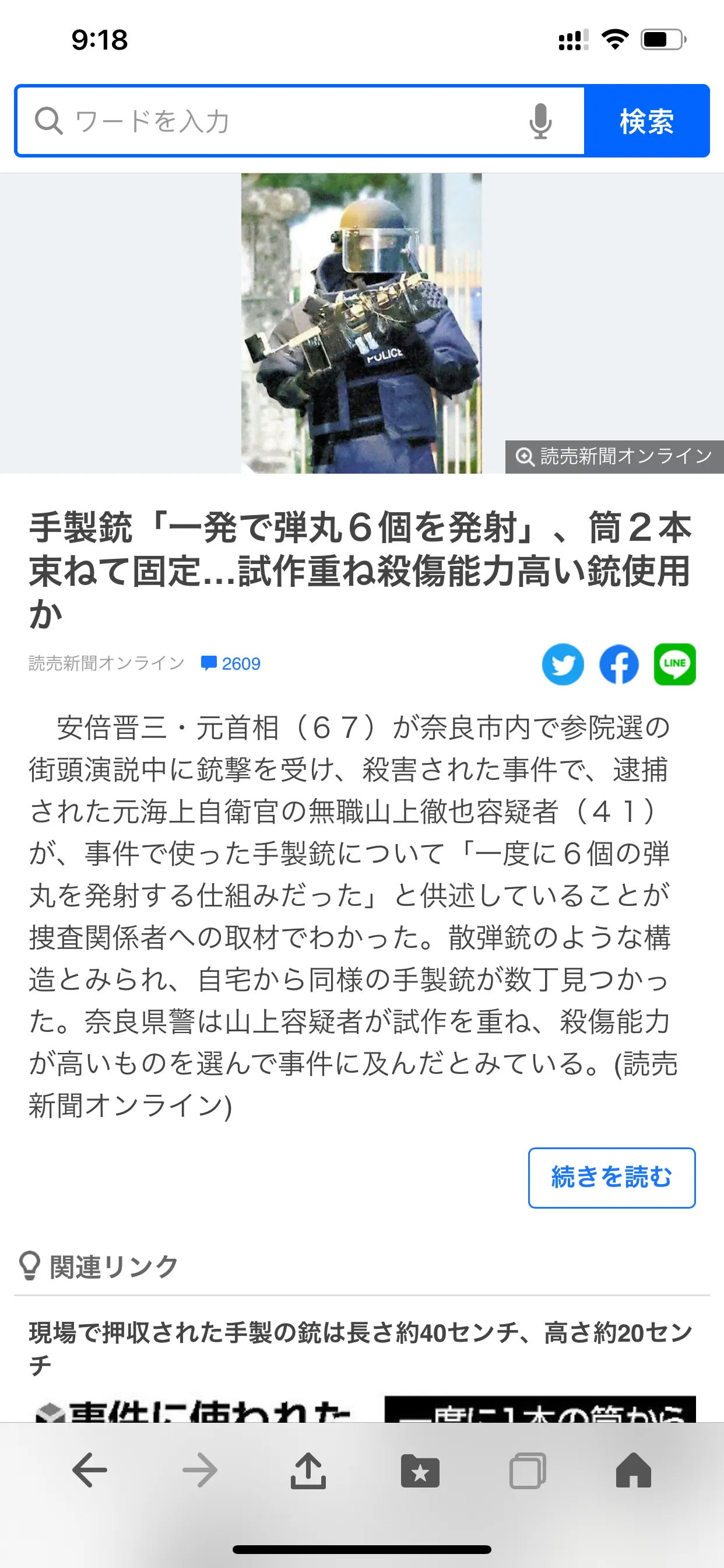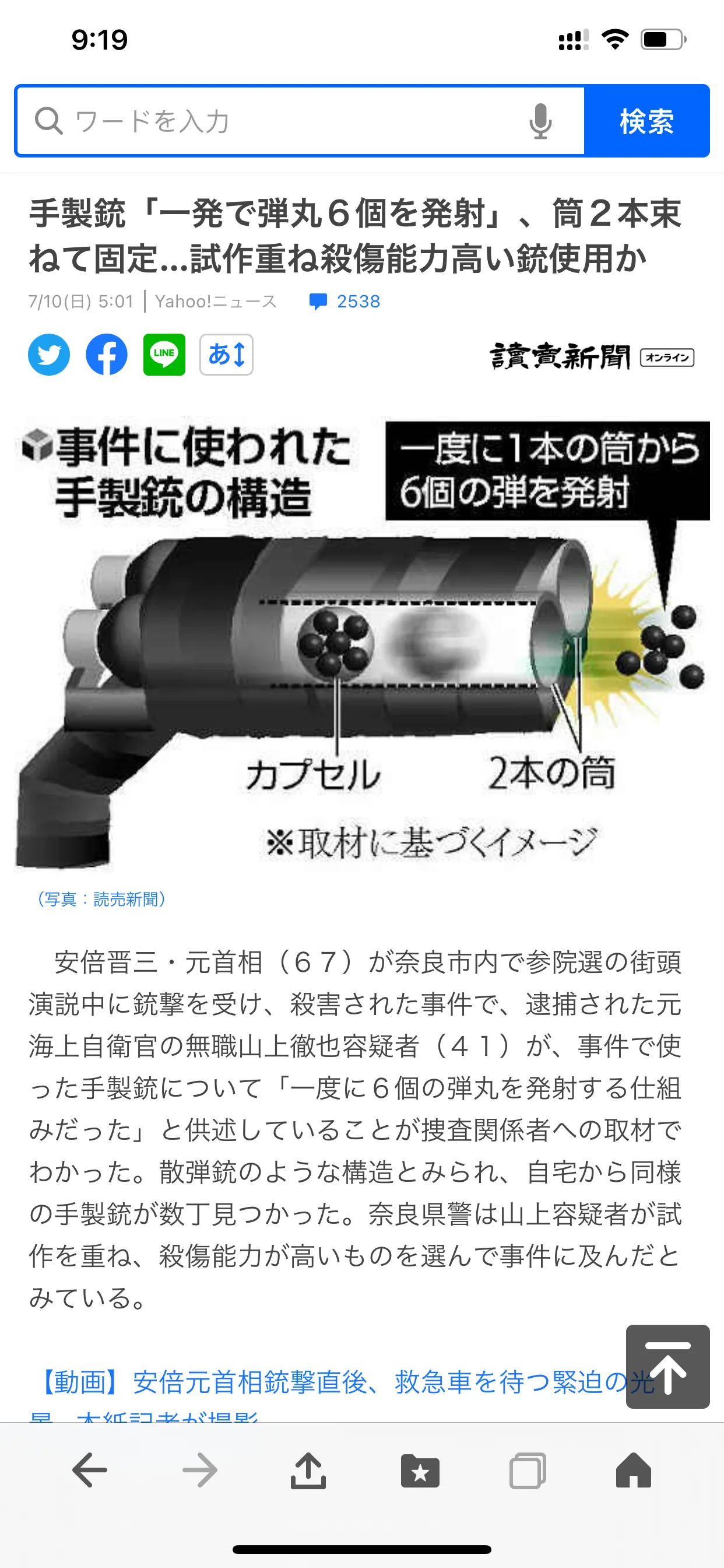 山上彻也关于武器的供词曝光!据日媒称,被逮捕的原海上自卫官嫌疑人无业山上彻也(41岁)对案件中使用的手制枪供述说,“这是一次发射6颗子弹的设计。”它被认为是一个类似散弹枪的结构,在家里发现了几支类似的手枪。奈良县警方认为山上嫌疑人反复试制,选择杀伤能力高的东西。8日上午11点半左右,山上嫌疑犯枪击了在奈良市近铁大和西大寺站前的路上演说的安倍氏,以杀人未遂嫌疑被现行犯逮捕。搜查相关人员表示,现场扣押的手工枪长约40厘米,高约20厘米。山上嫌疑犯的供述中,将两根金属制的筒捆在一起,用木制的木板或胶带固定。筒中装有类似胶囊的物品,胶囊中可以装入6个子弹,一次发射就可以从1个筒中弹出6个炮弹。照片为被认为是从山上嫌疑犯自家运出的手工枪的扣押物(8日奈良市)现场拍摄的影像显示,山上嫌疑犯从安倍氏背后6-7米的位置开枪。奈良县警察调查了安倍氏沿公路停在距离安倍氏约20米处的选举车的车体,在招牌部分确认到多个被认为是弹痕的孔。县警视其为流弹,可能从飞行距离等方面有相当大的威力。8日,县警搜查了奈良市内疑犯山上的住宅,找到了几把结构与案件中使用的类似的手工枪支。均是多个金属制的筒被粘合带捆束,也有捆束了9根的大型筒。就这些问题,山上嫌疑犯供述说:“在网上购买火药,也得到了空弹夹,然后自己装了”。他还说:“最初打算制造炸弹,但因为不顺利,所以决定制造枪”。县警认为山上嫌疑犯在自家制造枪,正在调查零件的获取途径等。