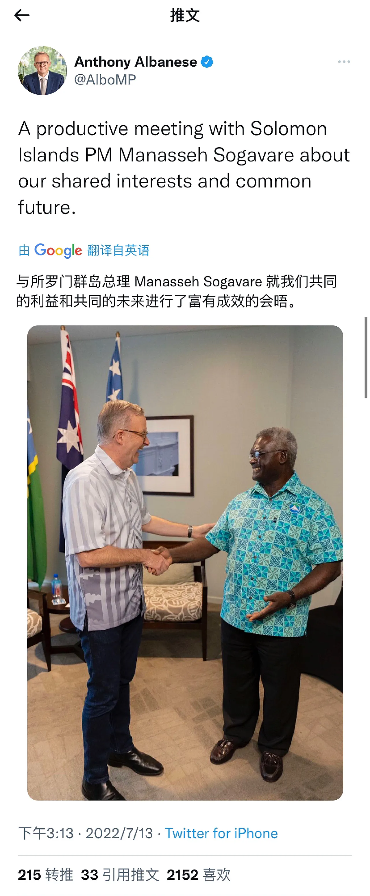 德国之声今天报道:“澳总理阿尔巴尼斯周四信心十足的明确发言,是在他与所罗门群岛总理索