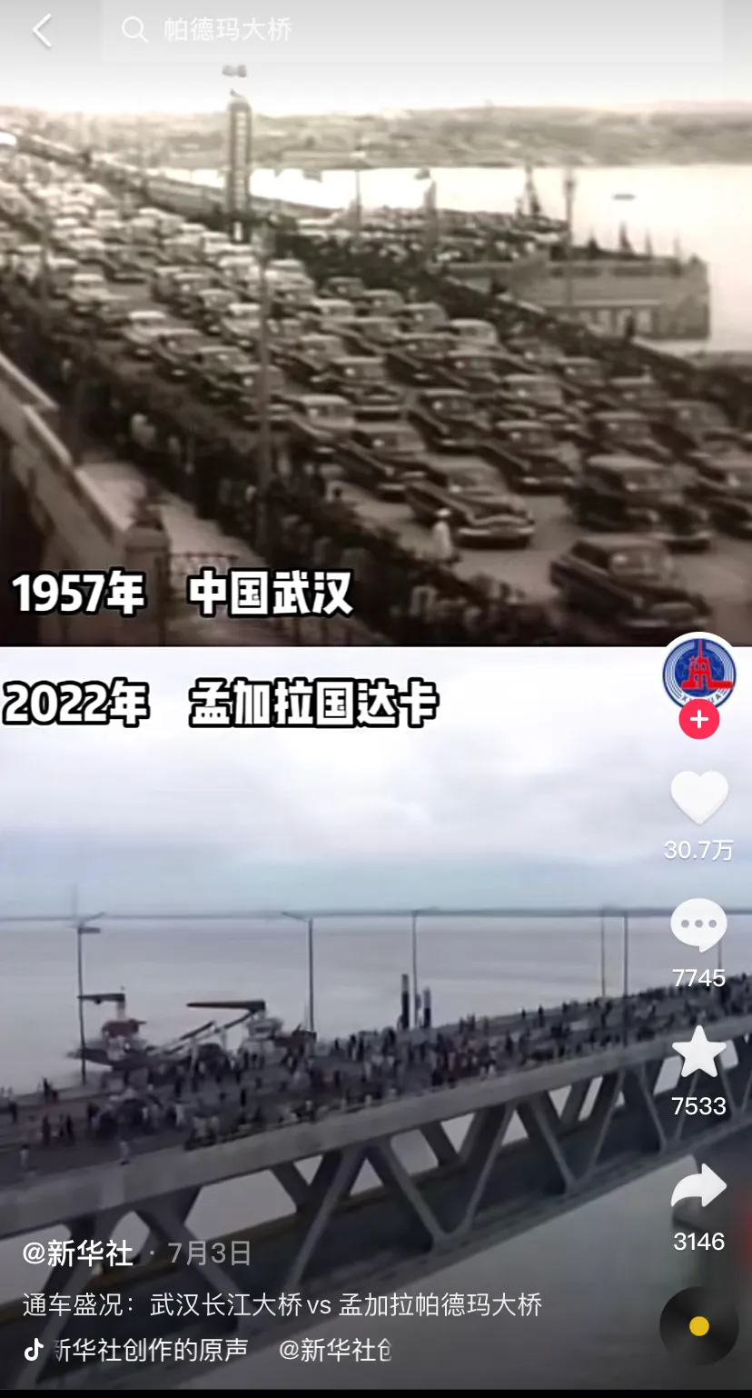 最近一件令孟加拉国举国自豪和鼓舞的一件事:历时8年,建成世纪“梦想之桥”——帕德玛大桥,该桥由中铁大桥局承建。以前需摆渡船通行,正常要几个小时,现在开车10公里只需10分钟。这是孟加拉国最大的基建项目,孟加拉国媒体将该桥建成称为孟加拉历史上仅次于独立建国的第二大历史事件。抖音上也有视频将1957年武汉长江大桥与2022年帕德玛大桥通车时的盛况进行类比,不同时代、不同国家,但是民众的激动喜悦之情是一样的。媒体报道,世界银行因孟加拉过政府腐败问题搁置了拟提供的资金,孟加拉国自筹39亿美元建设。经济学家预测,帕德玛大桥将为孟加拉国每年的GDP 增长贡献1.2%。 还将进一步增强孟加拉国与印度之间的贸易便利度,推动出口增加182%至297%。 当然,孟加拉人也没忘了讽刺一下印度,因为孟加拉国总理哈西娜拒绝以她的名字命名这座桥,所以孟加拉人呼吁印度领导人学习哈西娜。