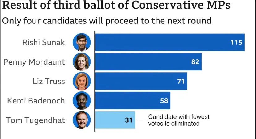 印度裔候选人将成为英国首相?英国首相争夺战本周一通过投票产生了四强,按得票多少排序如