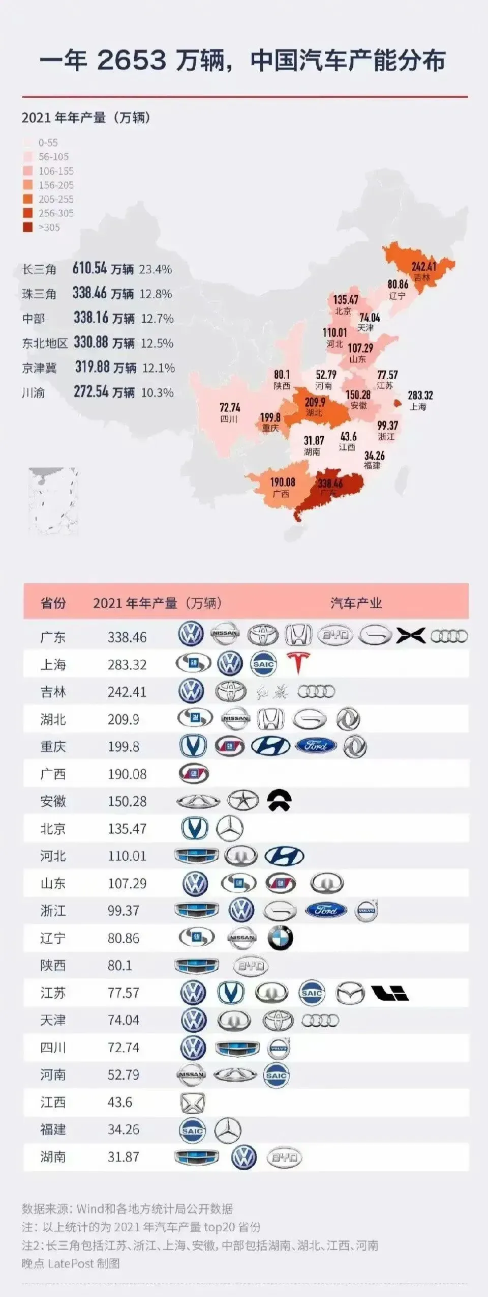 中国造车最大的省市,不是上海,而是广东,产能338万辆,上海只能排第二,产能283万辆,第