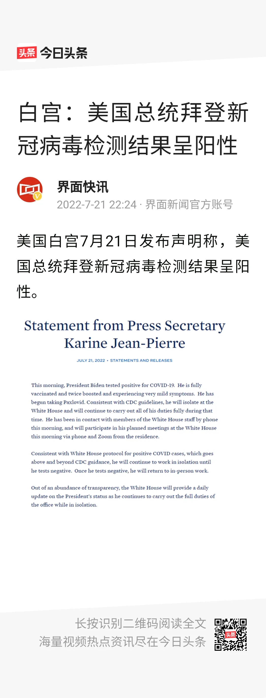 重磅突发,黑天鹅事件!美国总统拜登新冠阳性,以美国顶尖的医疗技术,大概率死不了,只不