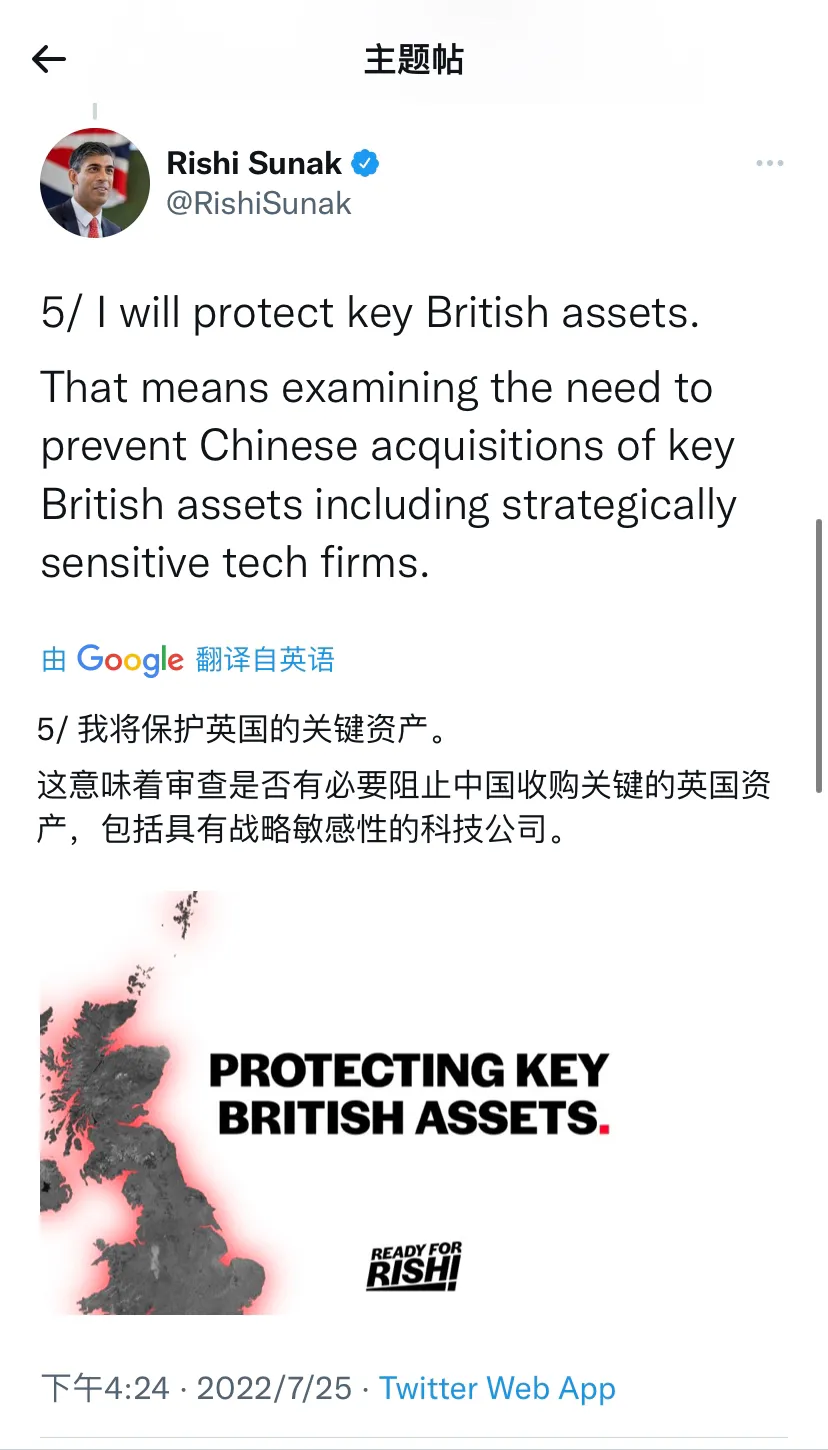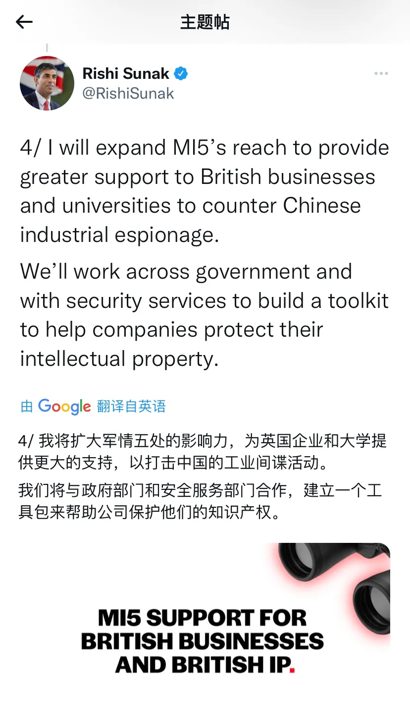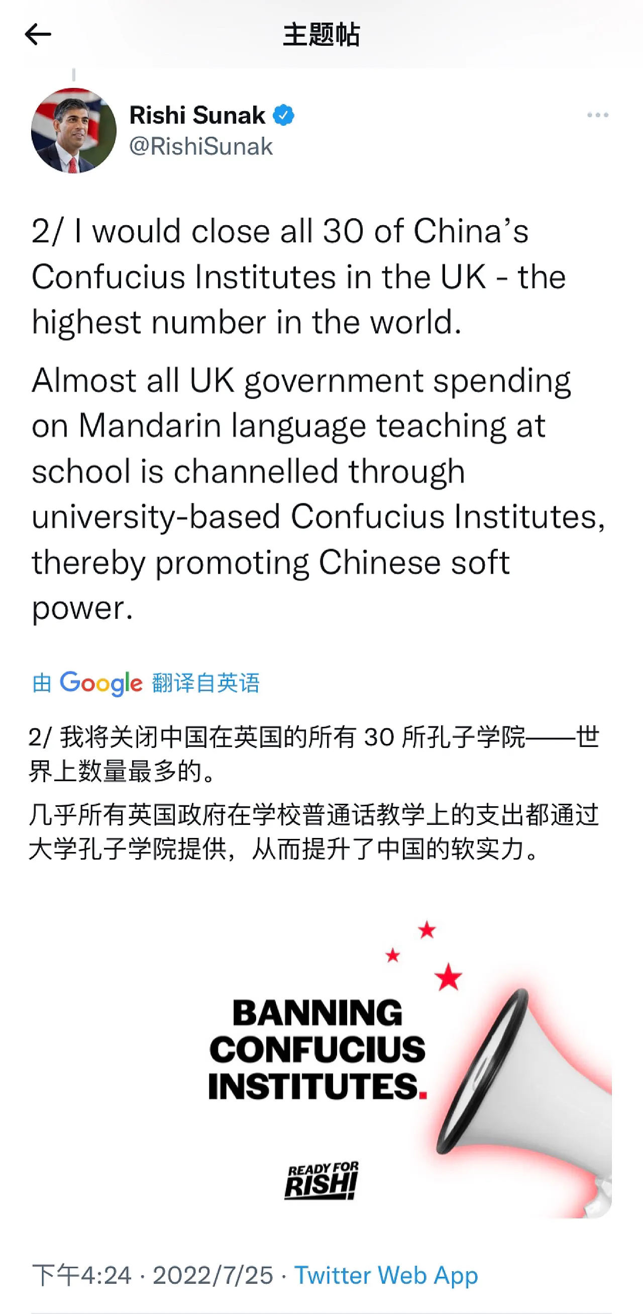竞选英国保守党党魁的前财相苏纳克今天(7月25日)叫嚣污蔑道:“中国和中国共产党是本世纪对英国和世界安全与繁荣的最大威胁。我将关闭中国在英国的所有 30 所孔子学院——世界上数量最多的。几乎所有英国政府在学校普通话教学上的支出都通过大学的孔子学院提供,从而提升了中国的软实力。我将建立一个新的自由国家国际联盟,以应对中国的网络威胁并分享技术安全方面的最佳实践。我将扩大军情五处的影响力,为英国企业和大学提供更大的支持,以打击中国的工业间谍活动。我们将与政府部门和安全服务部门合作,建立一个工具包来帮助公司保护他们的知识产权。我将保护英国的关键资产。这意味着审查是否有必要阻止中国收购关键的英国资产,包括具有战略敏感性的科技公司。”[机智]评几句:“中国在全球经济发展中扮演着重要角色,无视中国的话,英国会失去很多机会。”这是苏纳克此前的言论。现在选情焦灼,他的话风就马上变了。英国保守党的两位候选人争相把对华强硬作为竞选筹码。似乎这些外国政客不把中国作为竞争对手或威胁,都不好意思参选。整天不想着治理好自己的国家,整天想着对抗中国,这是病,得好好治。英国只剩一条漏水的航母了,打算把这条航母摆哪里?