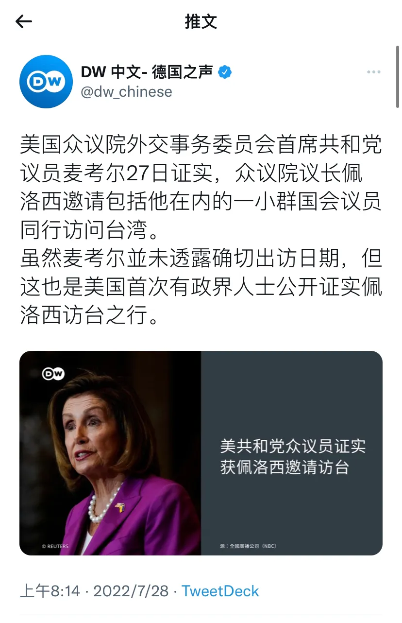 德国之声今天(7月28日)报道:“美国众议院外交事务委员会首席共和党议员麦考尔27日证实,众议院议长佩洛西邀请包括他在内的一小群国会议员同行访问台湾。虽然麦考尔並未透露确切出访日期,但这也是美国首次有政界人士公开证实佩洛西访台之行。”[机智]评几句:这些挑动世界各地区矛盾的战争贩子,越是被反对和抗议,越觉得自己窜访台湾有政治价值。我们讲的“后果自负”意味着,解放军将用行动来捍卫中国家主权。没有佩洛西这样的政客,我们还总担心一时半会下不了这个决心。希望佩洛西别怂,为中国的统一做出应有的贡献,以后的历史教科书会记录这一笔。