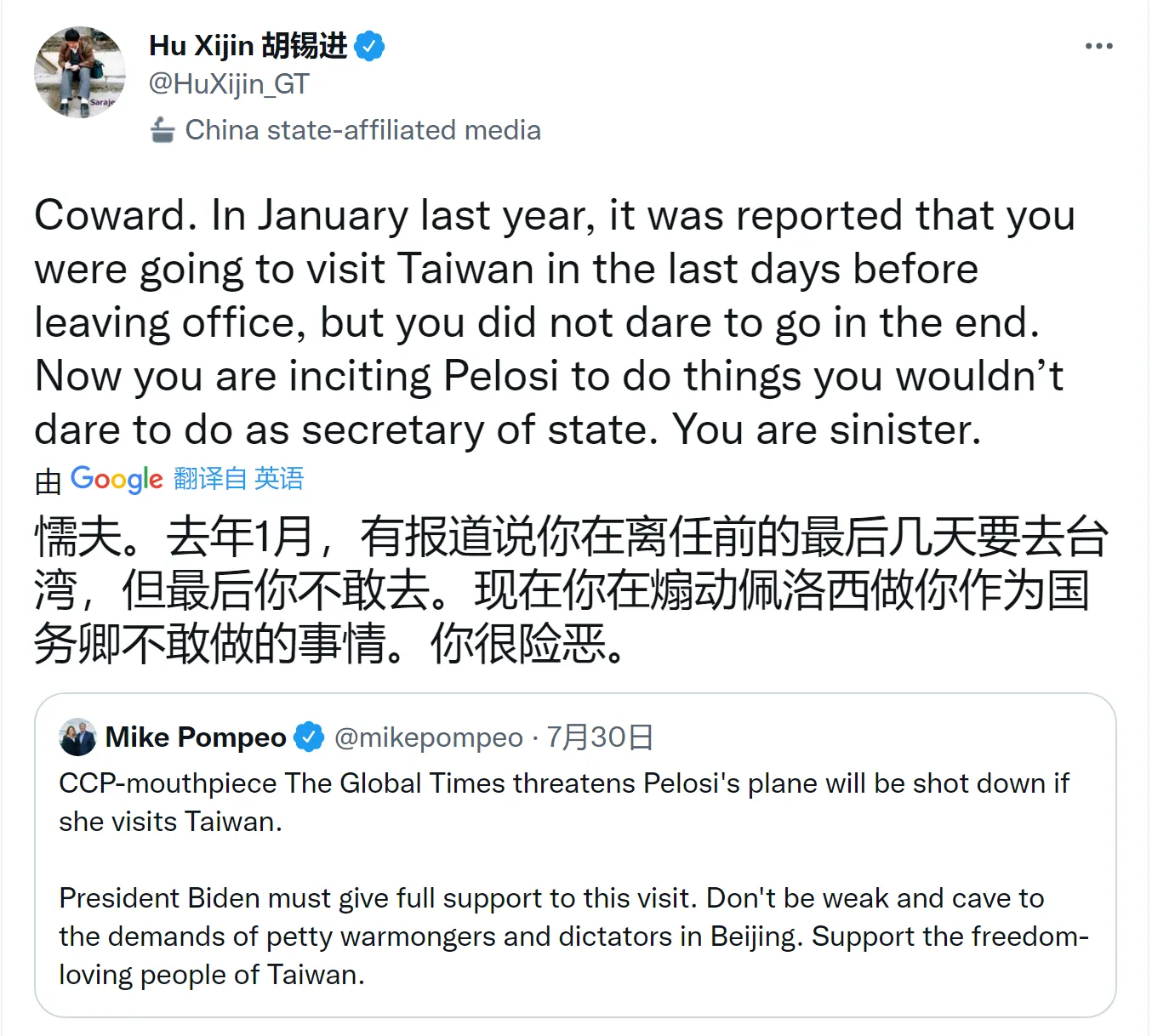 胡锡进发推称蓬佩奥是懦夫:自己当国务卿时不敢去台湾 却鼓动佩洛西去