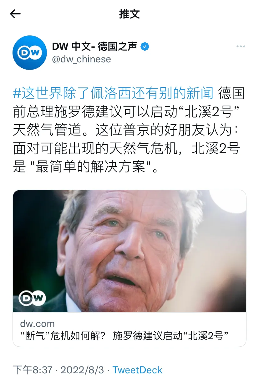 德国之声昨晚(8月3日晚)报道:“这世界除了佩洛西还有别的新闻。德国前总理施罗德建议可以启动‘北溪2号’天然气管道。这位普京的好朋友认为:面对可能出现的天然气危机,北溪2号是‘最简单的解决方案’。”[机智]评几句:实事求是,其实是最好的解决方案。但是在德国人看来,北溪2号的天然气既不民主,又不政治正确。随德国人自己折腾吧,让今年的冬天检验德国人的忍耐力和欧洲人的团结。