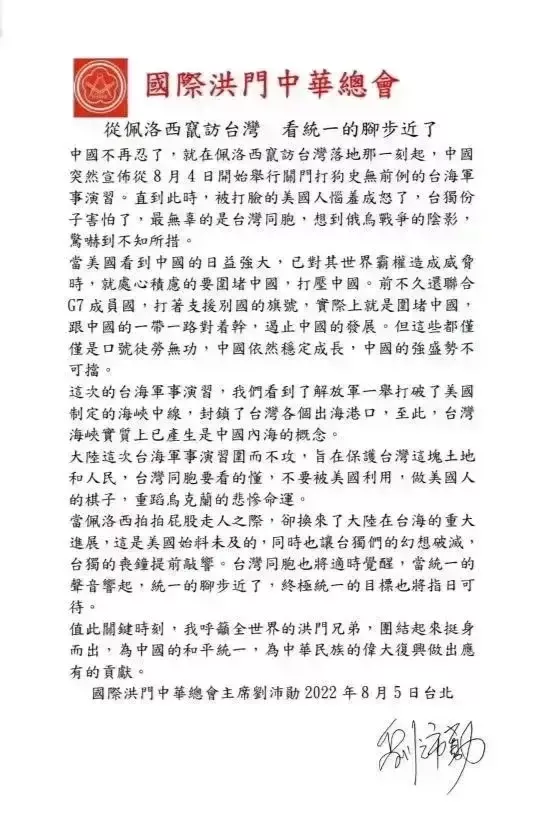洪门为祖国统一、民族复兴发声 在海外华人圈有着很高威望的洪门站出来,批评佩洛西窜台,