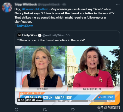 【佩洛西称“中国最自由”?葫芦里卖的什么药】当地时间8月9日,美国众议院议长佩洛西接受美国全国广播公司(NBC)早间节目《今日》(Today)的采访,这是她窜访台湾并返回美国后首次接受采访。佩洛西在采访中依旧指责中方、为自己的窜台举动辩护,声称“我们不能允许中国大陆孤立台湾”云云。除了通篇的陈词滥调,一个小片段却意外引发关注。就在这一通“甩锅”话术中,佩洛西却突然提到:根据某非政府组织调查,“中国是全球最自由的社会之一,它是一个强大的民主(国家),有着勇敢的人民……”观察者网查询发现,根据《今日》(Today)节目8月9日在其官方YouTube频道发布的完整采访视频,佩洛西确实说的是“中国是世界上最自由的社会之一”(China is one of the freest societies in the world)。不过,此处很有可能是一处口误,她原本想夸赞的对象应该是“台湾地区”。根据这段采访的上下文语境,佩洛西始终刻意渲染了“中国大陆和台湾地区”的对立,同时强调所谓的“美台友谊”,“批陆挺台”的意图非常明显。同时,在佩洛西官方网站公布的采访实录中,这段话中的主语“China”也被替换为“Taiwan”。因此,这段话实际上是佩洛西援引被中方制裁的所谓“由美国政府资助的非政府组织”的评估排名来故意抹黑中国大陆,渲染大陆民众所谓的不自由。
