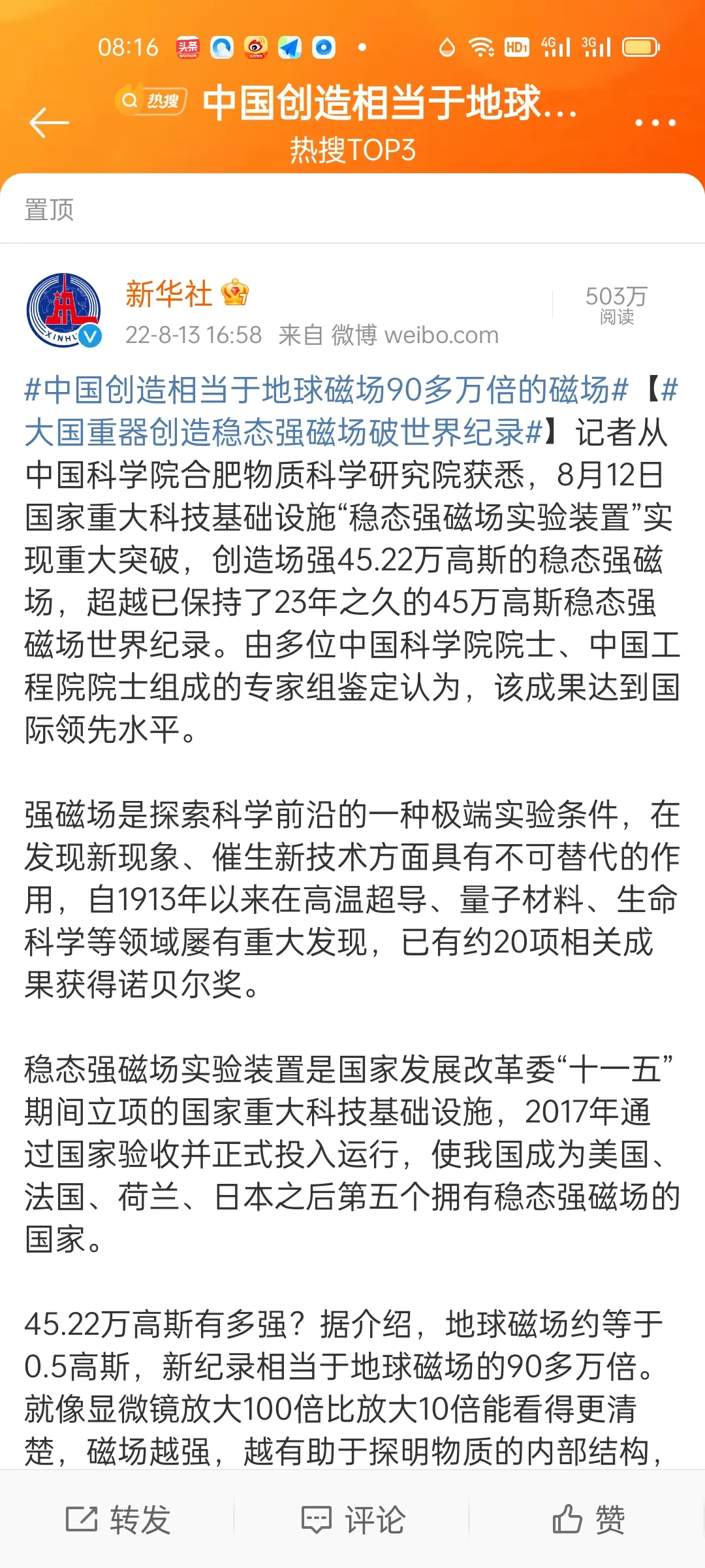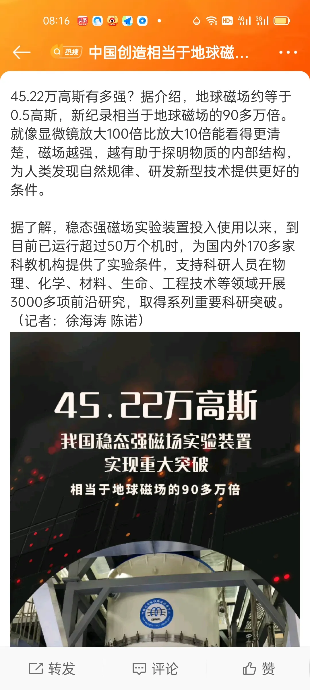 不觉明厉!中国创造出相当于地球磁场90多万倍的磁场。中科院合肥物质科研院,45万多高斯稳态强磁场装置重大突破。45.22万高斯有多强?据介绍,地球磁场约等于0.5高斯,新纪录相当于地球磁场的90多万倍。磁场越强,越有助于探明物质的内部结构,为人类发现自然规律、研发新型技术提供更好的条件。 这是硬核力量,各种核&电磁实验都用得上厉,打破了美国保持了23年的记录,荣登世界第一!这么明显的磁场改变会不会被外星人发现?啊!这要是在里面放一杯水,喝掉岂不是会长生不老寿与天齐。