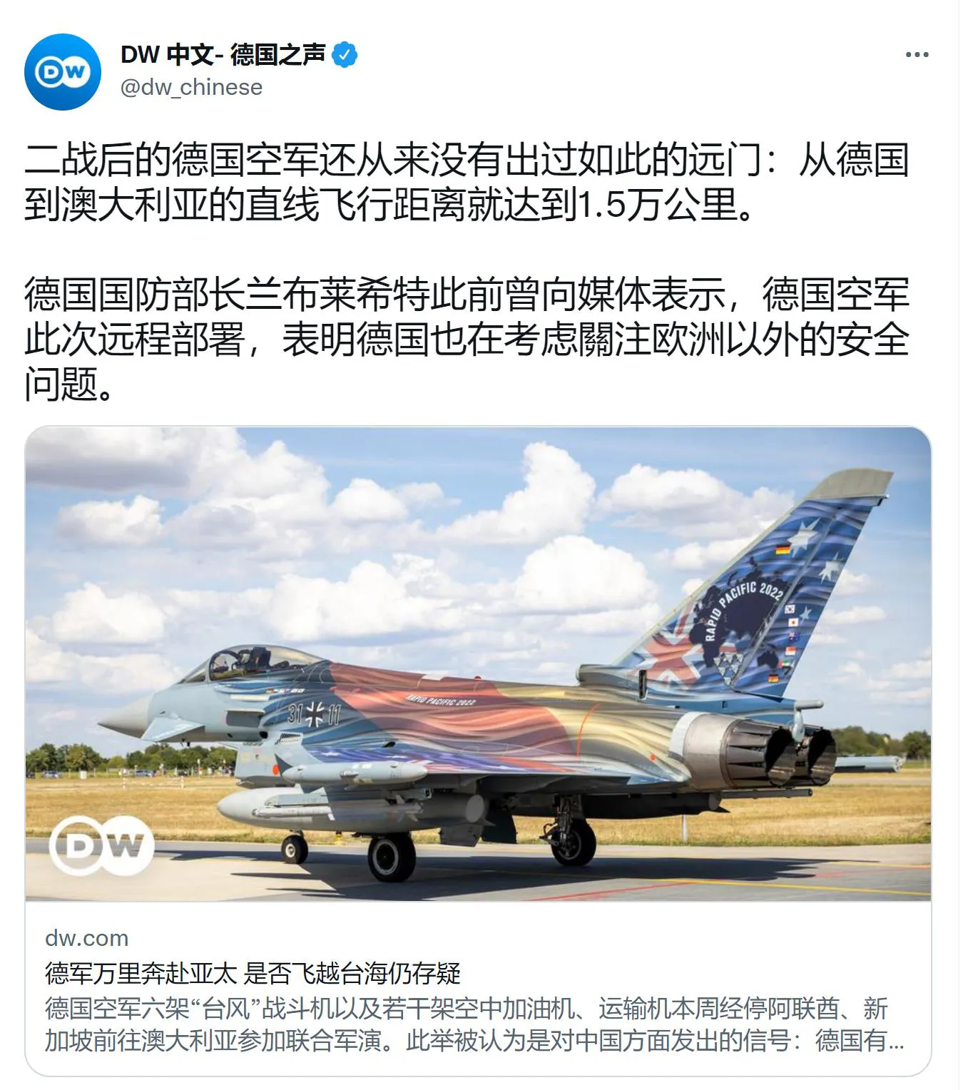 德国之声今天晚上(8月18日)发文说:“二战后的德国空军还从来没有出过如此的远门:从德国到澳大利亚的直线飞行距离就达到1.5万公里。德国国防部长兰布莱希特此前曾向媒体表示,德国空军此次远程部署,表明德国也在考虑關注欧洲以外的安全问题。”德国《每日镜报》援引空军内部消息人士指出,德国联邦国防军此次飞越两万公裡前往澳大利亚参加由17国参加的联合军演,旨在向&34;。评一句:历史发展又到了十字路口,难道德国还想重蹈覆辙?