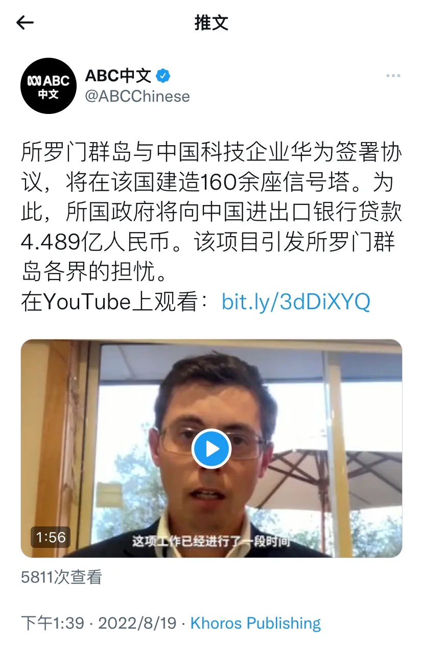 澳大利亚广播公司今天报道:“所罗门群岛与中国科技企业华为签署协议,将在该国建造160余