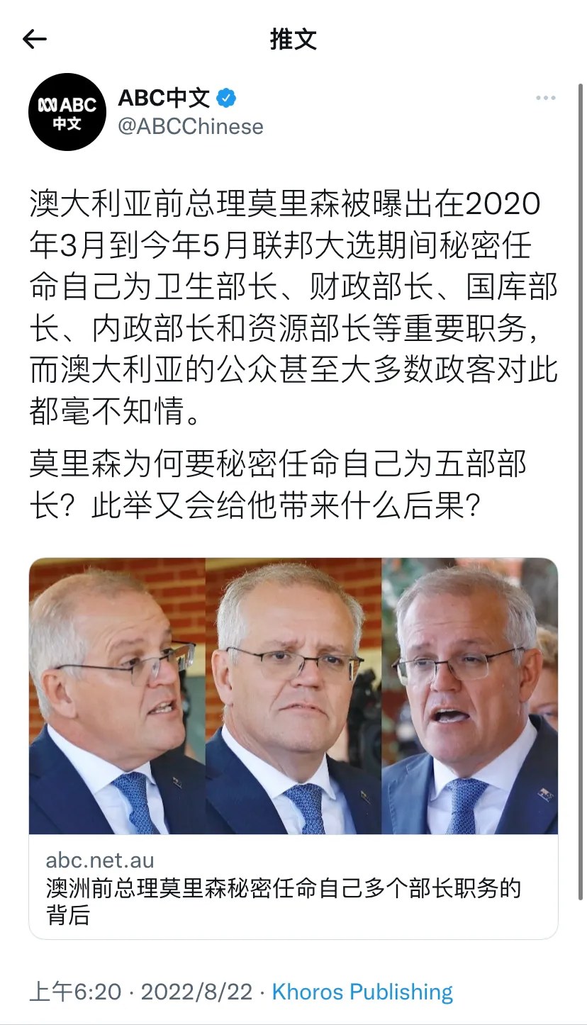 澳大利亚广播公司今天(8月22日)报道:“澳大利亚前总理莫里森被曝出在2020年3月到今年5月联邦大选期间秘密任命自己为卫生部长、财政部长、国库部长、内政部长和资源部长等重要职务,而澳大利亚的公众甚至大多数政客对此都毫不知情。莫里森为何要秘密任命自己为五部部长?此举又会给他带来什么后果?”[机智]评几句:莫里森自己给出的理由是当时担心有的部长患新冠而失去能力,所以自己兼任了五个部长,而且没有对外宣布。这个说法已经被很多澳大利亚政客和媒体质疑和批评。现在澳大利亚的舆论希望莫里森自己辞掉议员。但是莫里森显然不愿意从澳大利亚国会议员的位置上离开。