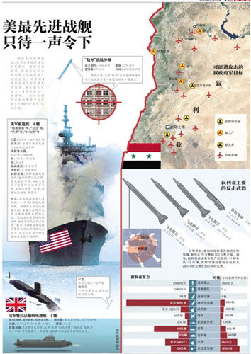 根据美英媒体报道,美军的4艘驱逐舰和英军的一艘核动力航母,将成为巡航导弹远程打击叙利亚计划的主力。美军的4艘驱逐舰是世界最先进战舰,拥有强大攻击力。4艘战舰和一艘潜艇、一次任务将可以向叙利亚目标发射至少400枚“战斧”巡航导弹。