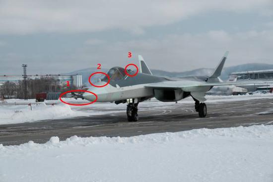 最值得注意的是,T-50-6-2装有雷达、前视光电仪与上下各一的101KS-O光电防御装置,但T-50-8的前视光电仪(如下图标示2)与光电防御装置(标示3)皆为模型,且机首与T-50-1一样装有大气数据传感器(空速管,标示1),没有雷达。