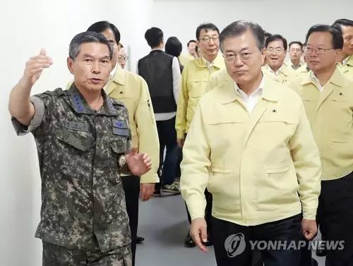 8月23日,韩国总统文在寅(前排右)视察联参本部战时指挥所。(韩联社)