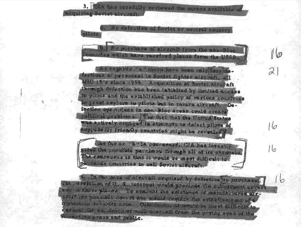 解密文件中列出多种苏联飞机机型,包括米格-17、米格-19战斗机和伊尔-14运输机等,以及为抵抗远距离侦查和近距离检视,复制上述机型需要多少时间和成本等等。根据档案中记录的美国中央情报局的分析,另一个选项是通过策反飞行员来获取飞机,或者从非苏联阵营国家购买,但这些做法被认为可行性存疑。