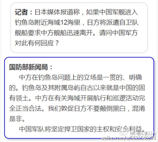 军事:中国军方回应日拟派军舰进钓鱼岛称将坚定捍卫国家安全