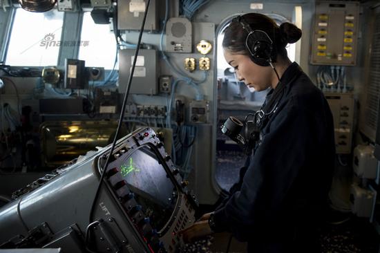 图为在美国奇尔沙治号(LHD-3)两栖攻击舰上服役的韩·卡尔特,她正在紧盯着航海雷达屏幕。
