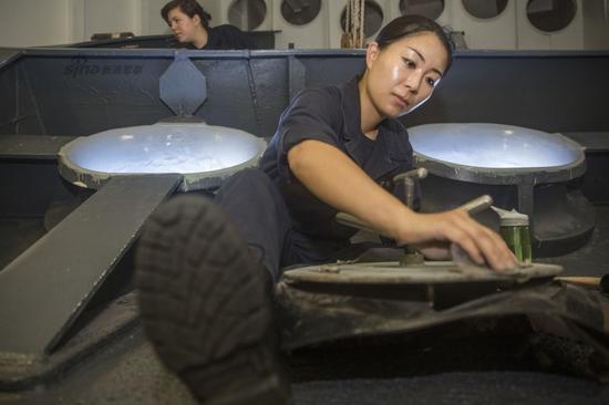 2015年6月23日,大西洋,美国奇尔沙治号(LHD-3)两栖攻击舰上来自于中国四川的女孩韩。卡尔特(Han Kalt)正在维护战舰轴承。