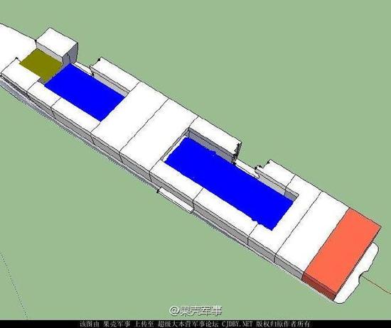 图为新国产航母机库空间示意图,蓝色区域是主机库,红色为舰尾维修和弹药存储区域,在靠近舰首机库蓝色区域的绿色区域是原辽宁号航母的原型“瓦良格”航母安装SS-N-19“花岗岩”超音速反舰导弹的区域,新航母将会将这个区域整理出来用来储备油水和生活物资。如此一来,新国产航母虽然吨位比辽宁号只是略有增加,但是内部空间和机库容积将比辽宁号增大30%左右,由此可推算,国产航母可比辽宁号多搭载10架作战飞机,目前我国第一艘航母辽宁号可搭载两个中队24架歼-15和12架直升机。