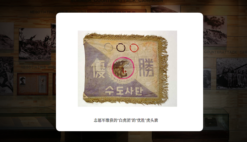 军博官网陈列着被志愿军缴获的该联队“优胜”虎头旗。这面旗上下方的朝鲜文字是“首都师团”,虽然不是联队旗,但据说是李承晚奖给该联队的荣誉旗帜,算是“御赐”之物。