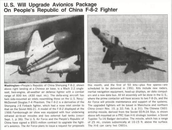 美国空军和中华人民共和国签署了一份价值5.01亿美元的合同,前者将负责对中国的(F-8-2歼-8Ⅱ)航空电子设备进行升级。所有设备组装都将在美国完成,美国的设备制造商可以接触到两架F-8-2战斗机,美国空军将负责为中国飞机提供维护和系统支持。按计划,美空军将在11月提交一份分包征询方案,第一批50套机载雷达火控系统和5套备份将于1991年交付。升级设备包括雷达、惯性导航设备,平视显示器,大气数据计算机和一个新的数据总线。