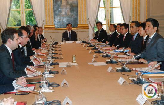 图为5月2日,在法国首都巴黎,法国总统奥朗德(左二)会见到访的日本首相安倍晋三(右一)。