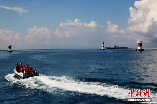 5月8日至9日,航行至中国南沙海域的中国海军南海舰队远海训练编队,对南沙各岛礁及附近海域进行巡航。在巡航过程中,远海训练编队带动守礁部队进行实战条件下的攻防演练,提升守礁部队的防卫作战能力。图为合肥舰释放小艇巡航南沙岛礁。中新社发 黎友陶 摄