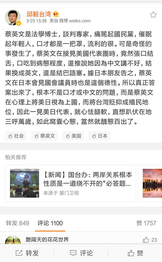 相信大家对蔡英文24日的那段视频已经有所耳闻。今日(25日),国民党籍时评人邱毅在微博上评价蔡英文:痛骂起国民党,催眠起年轻人,口才流利得很,一见美日代表就腿软。