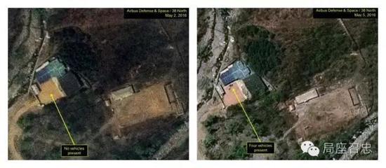 ▲位于核试验场以南6公里处的建筑,通常认为这里是核试验的指挥中心。在5月2日和5日的照片对比中,其停车场发生了变化。右边5月5日的卫星照片中多了4台车。